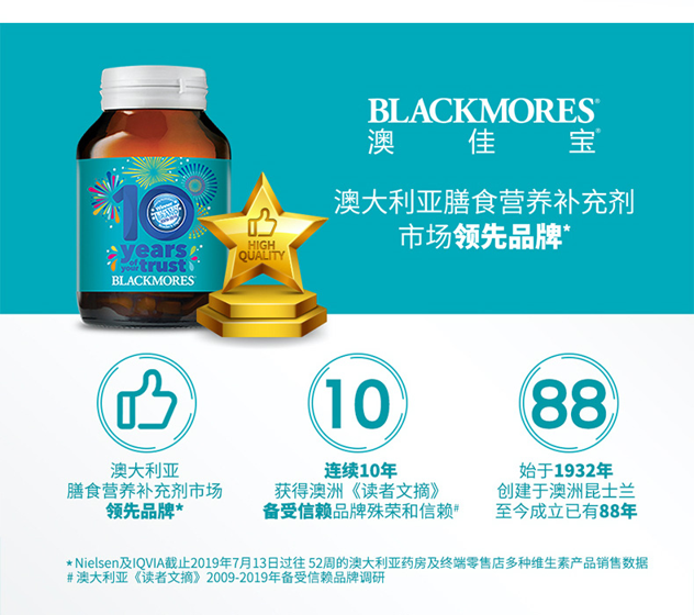 天猫BLACKMORES海外旗舰店139元,可领50元优惠券,实付89元到手;Blackmores,又名澳佳宝。是澳大利亚本土的保健品品牌。成立于1930年,已经有近87年历史。在1985年5月正式成为上市公司。目前拥有超过400名员工 ,总部设在澳大利亚悉尼。销售的国家包括澳洲、新西兰、马来西亚、新加坡、泰国、韩国、中国台湾、香港及大陆地区。