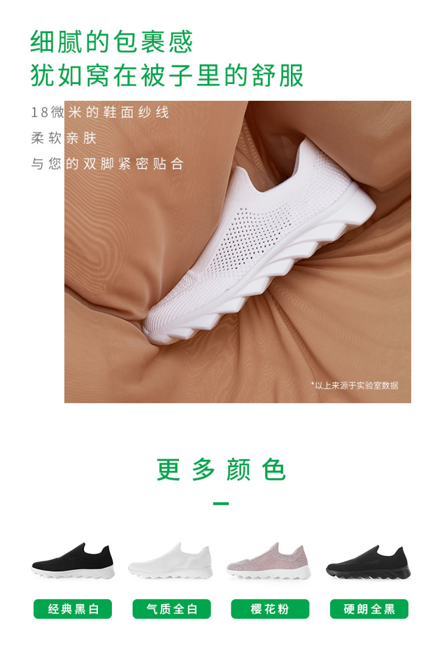 这款健步鞋鞋面采用的是18微米的纱线,更为亲肤柔软,具有极为细腻的包裹感,一脚蹬的设计,与脚面的接触面积大,走路更为舒适。