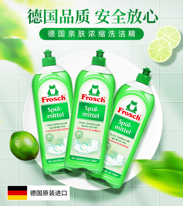 这款Frosch 柠檬浓缩洗洁精,萃取天然柠檬果皮精华,可迅速瓦解油污去异味、低泡浓缩强水溶性,轻松过水,碗具更洁净,产品高浓缩技术,不添加增稠剂,3-5ml可兑5L水,高效清洁的同时,保养洗济对象;瓶身可自然降解,环境零负担;使用之后,手感温润,拒绝干燥、紧绷甚至过敏反应。