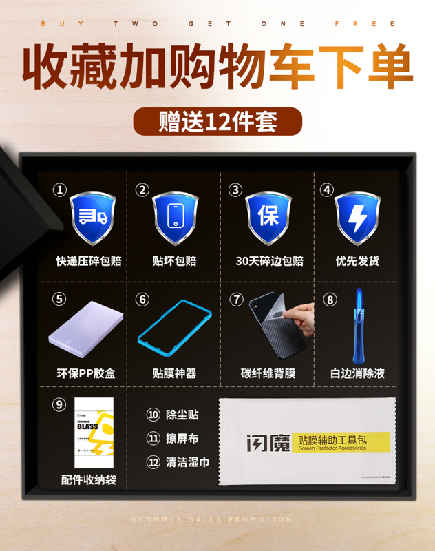 电镀版抗指纹,有多个型号可选。表面有抗指纹涂层,疏水疏油,不易粘指纹,滴水成珠,2.5D倒角,边缘更顺滑,有效减少外力冲击。采用全球第二大玻璃制品公司-旭硝子的玻璃,透光率高,9H硬度,厚0.33mm,触控灵敏的同时,耐磨耐刮,有效减少手机屏幕上的划痕。