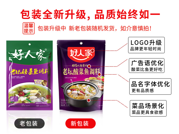 这款好人家 老坛酸菜鱼调料包,选用泡够220天的酸菜,爽口入味,一袋调料包可做3斤鱼肉。烹饪出的酸菜鱼酸香可口,亦可烹制酸菜猪蹄、酸菜肥牛等菜品。