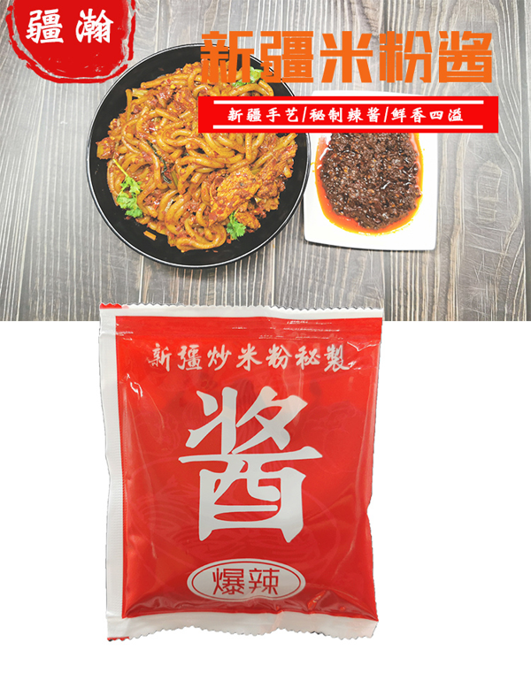 新疆炒米粉是一道新疆本地的名小吃。除了使用的米粉比较粗有嚼劲外,最关键的还是要靠酱油,吃的就是这个味道,精选优质香料,经过秘制配比而成,可以炒米粉、炒馕、炒年糕等各种美食。
