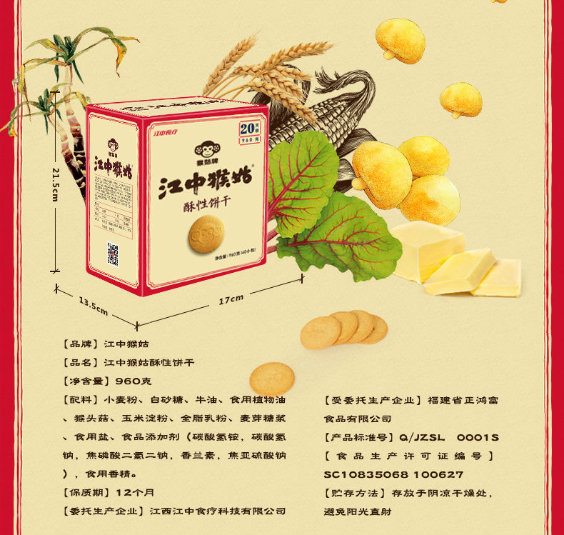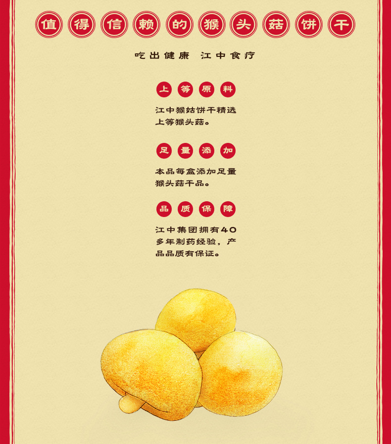 这款猴菇饼干里面就含有一定的猴菇菌,每盒含猴头菇干品约11%,相当于643g鲜品,二者合一、营养价值极高,可以有效护胃养胃,口感上会有一丝丝苦,但是并不难吃。规格为960g,精致盒装,可以送人。