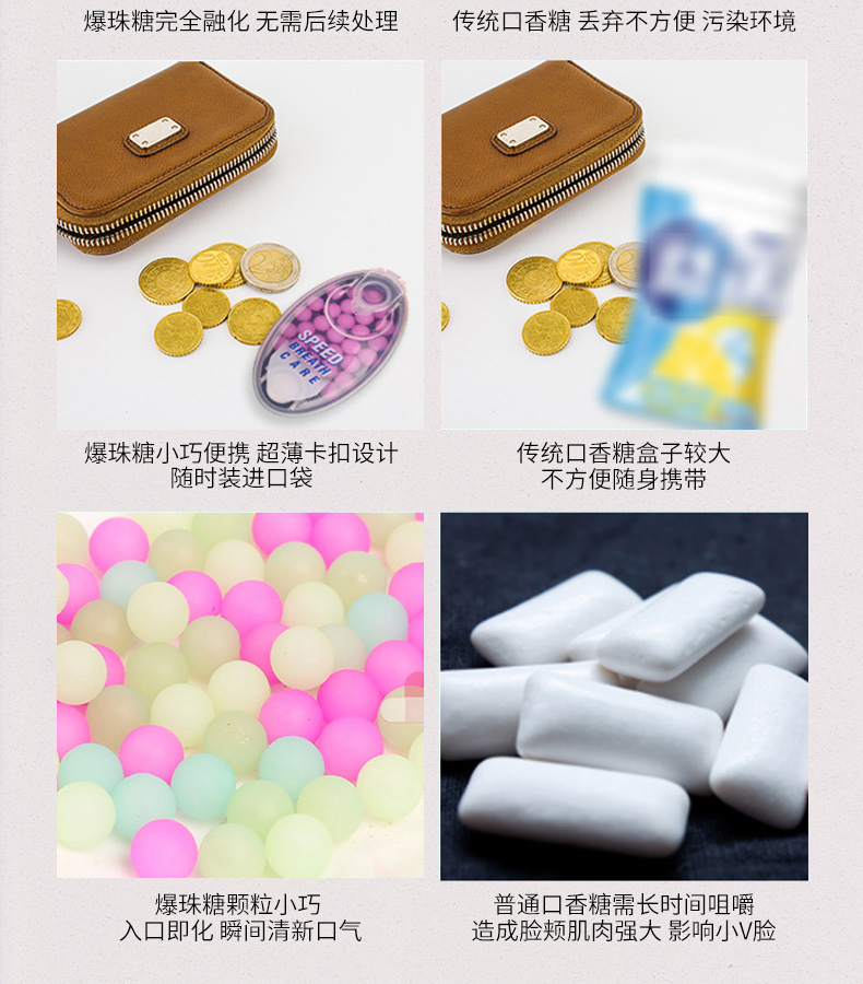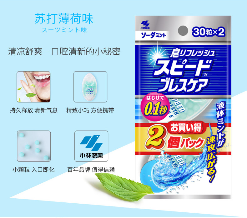 这款小林制药的爆珠清新丸与一般的口香糖、爽息丸均不同,这款是立竿见影,入口后能够瞬间清新口气,防止尴尬,苏打薄荷的清新,能持久释放清新口气,约会、开会以及抽烟后等情况均适用,规格是30粒*2盒,均是便携包装。