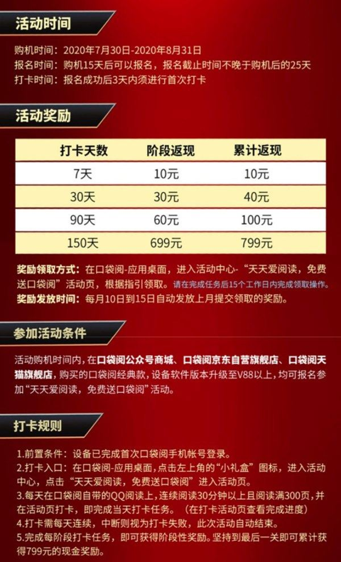 天猫口袋阅旗舰店实付799元到手,7月30日-8月31日购机可参与打卡0元购活动(活动详情可至活动页面查看),打卡满150天全额返现799元,有需要的朋友可以关注,这款给孩子用非常好。