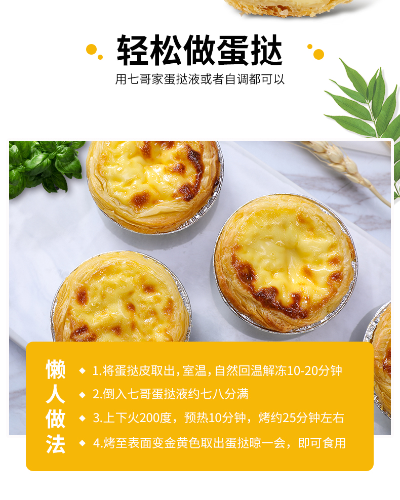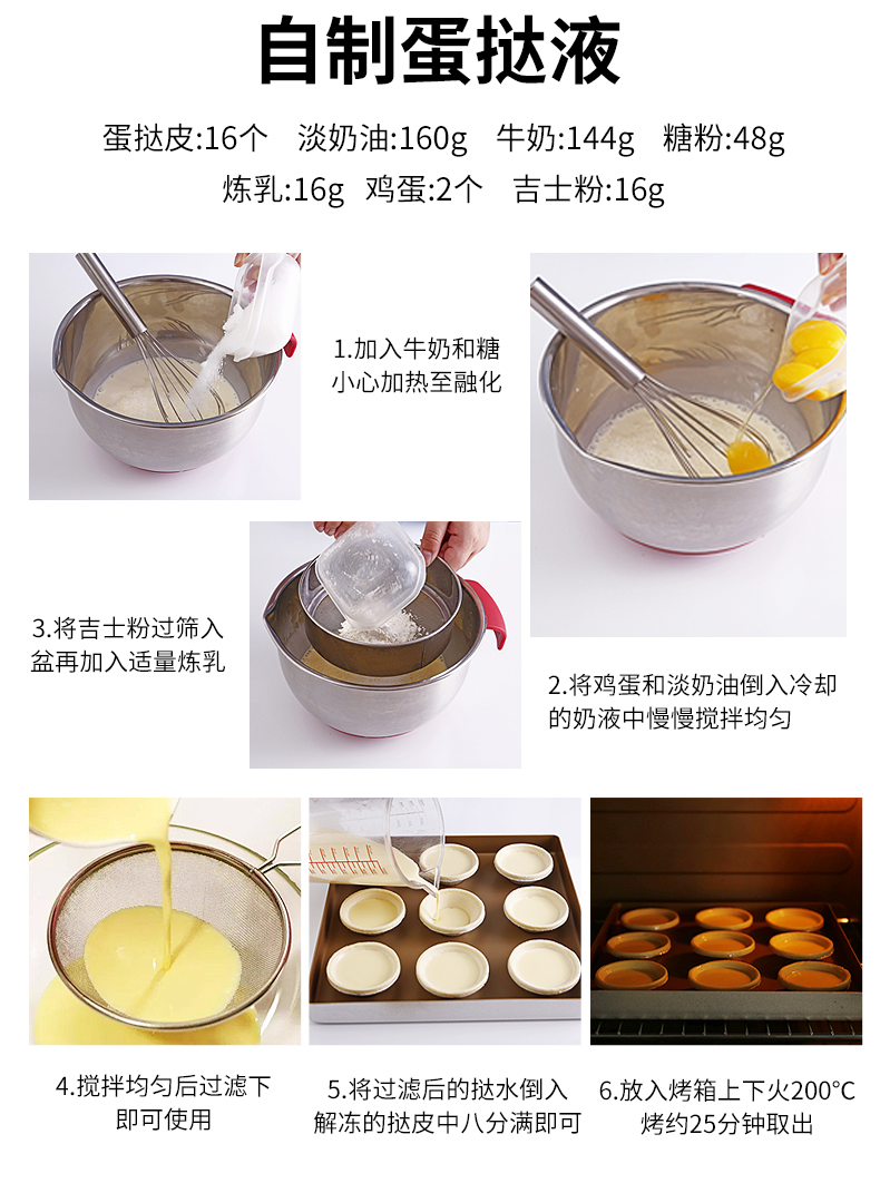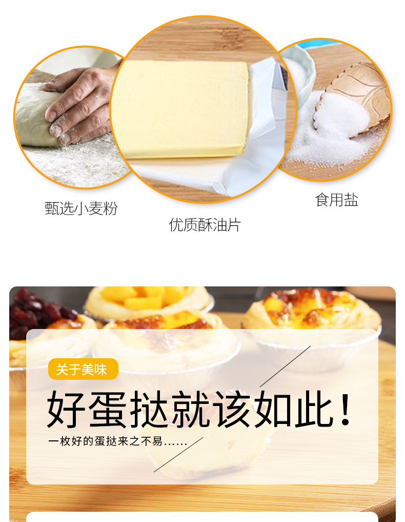 蛋挞皮采用益海嘉里小麦粉、酥皮油等制作而成;蛋挞液采用鸡蛋、纯牛奶等制作而成。层层酥脆,美味可口,营养价值高,制作简单方便,在家轻松做蛋挞。