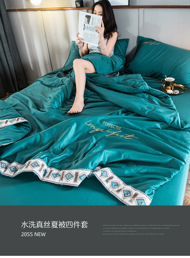 这款帛罗旺斯 夏季水洗真丝夏凉被四件套,采用的是聚酯水洗真丝面料,清凉透气,柔软贴身,触感丝滑;内里填充中空聚酯纤维丝线,高弹蓬松,被套上还有精美刺绣,非常贵气。