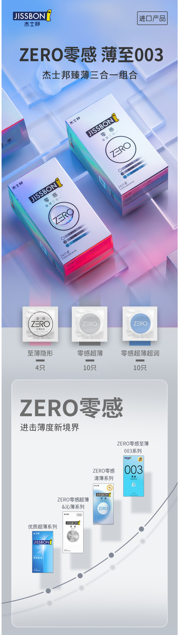 这款杰士邦 零感超薄 空气套,单件包含:零感·超薄 10只,零感·至薄隐形 4只,零感·超薄潮润 10只,共24只。