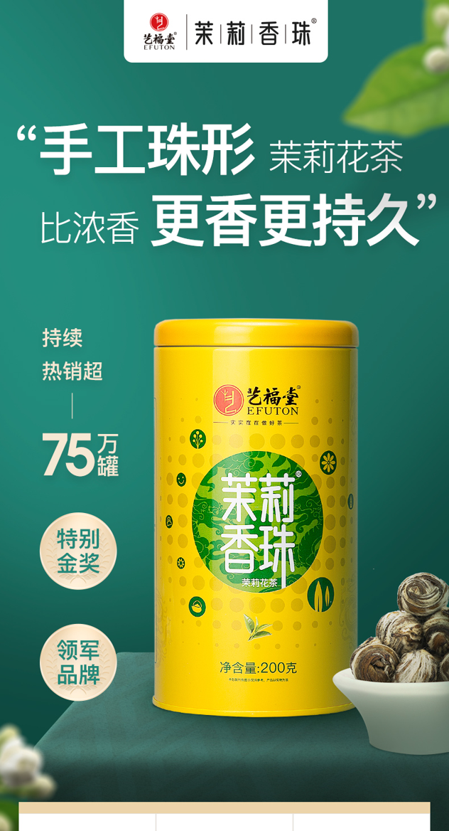 艺福堂这款茉莉香珠,热销超75万罐,连续斩获了2017年全国茉莉花茶特别金奖,2018年度品质类金麦奖,和2019年中国茶叶集群品牌联盟(春季) 茶叶超级单品等多项权威奖项。