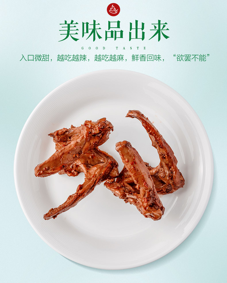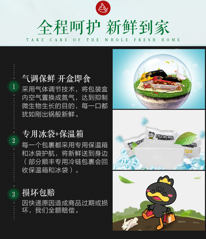 周黑鸭微甜爽辣,入口有点甜,而后越吃越辣,越吃越麻,越吃越香,最后往往一把鼻涕一把泪。“锁鲜装”系列主要是方便保存,在具有气体阻隔性能的包装盒内充入99%的氮气,能有效减缓新鲜食品的变质速度,并且保持口感新鲜。