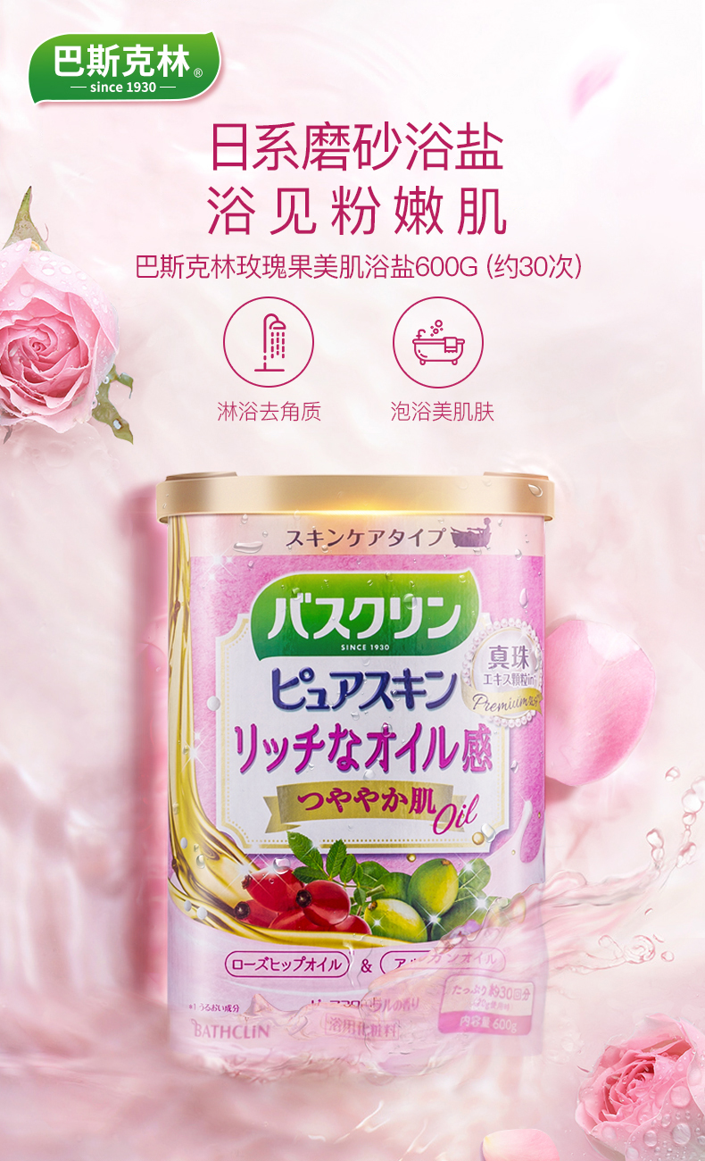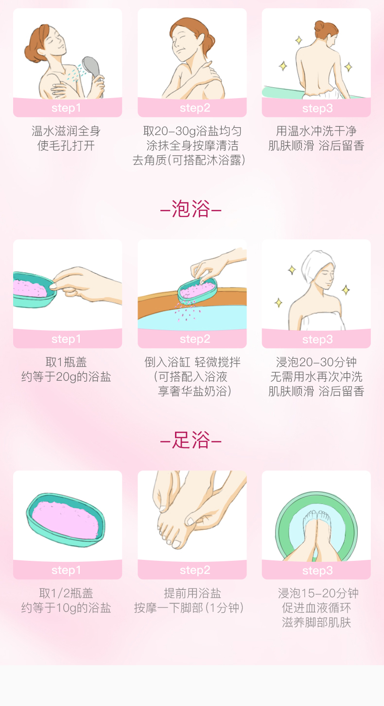 第一款 玫瑰果美肌浴盐,日系粉色磨砂浴盐,精选温泉矿物细盐、珍珠提取物,还特别添加了玫瑰果油、摩洛哥坚果油、荷荷巴油,可深入补充肌肤所需营养,轻柔磨砂,能去角质,去鸡皮,祛痘!美白滋养保湿,皮肤滑溜溜,还可缓解情绪,放松身心。规格:600g 约可用30次。
