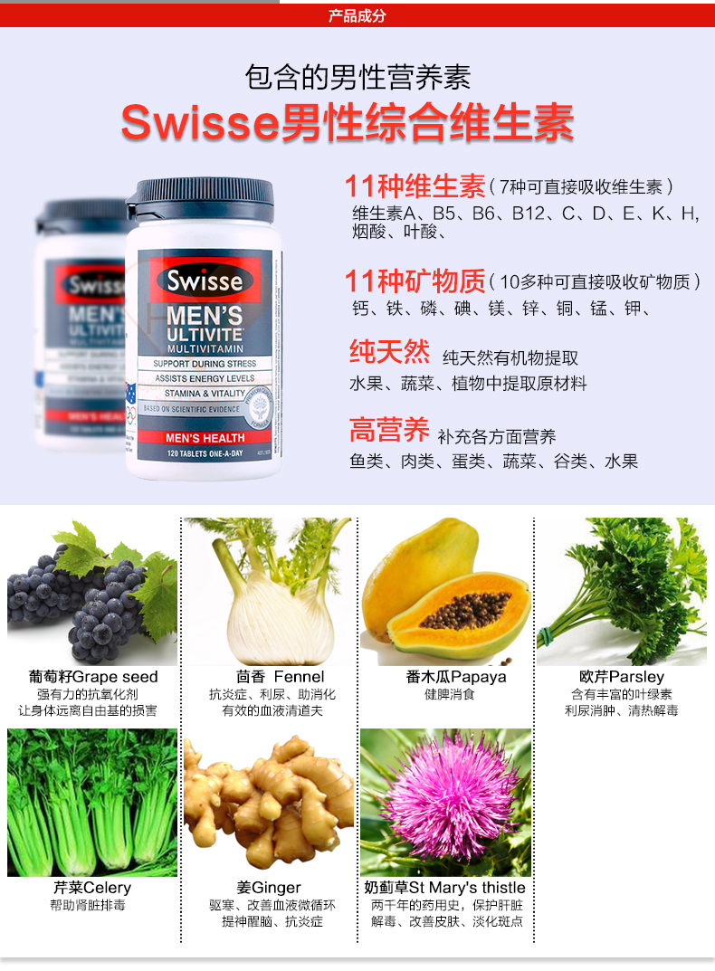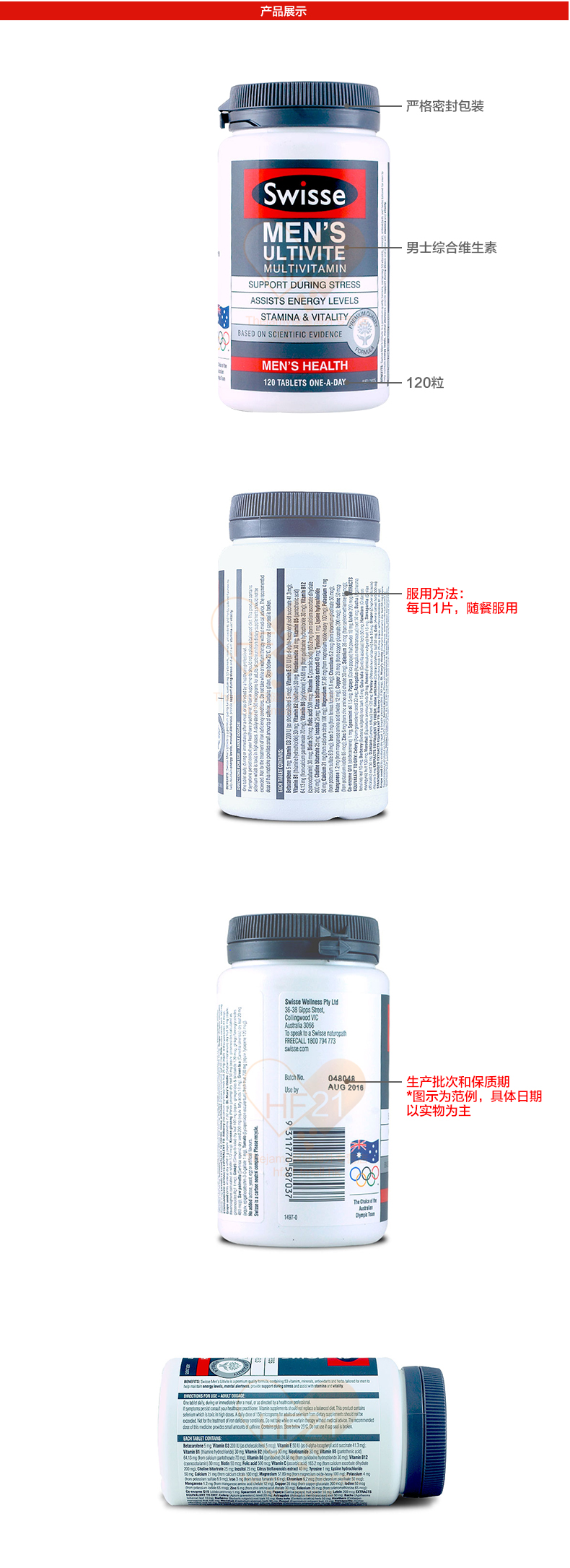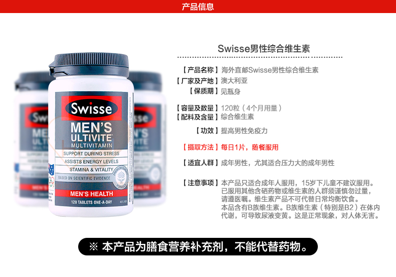 120粒装,四个月用量。这款Swiss维生素片,专为男士定制,富含高达53种维生素,采用独特配方,营养均衡更丰富,不含防腐剂,食用安全健康。每日维生素,提升身体能量和耐力,增强免疫力,减压抗疲劳,为男人身体提供更好的能量支持。