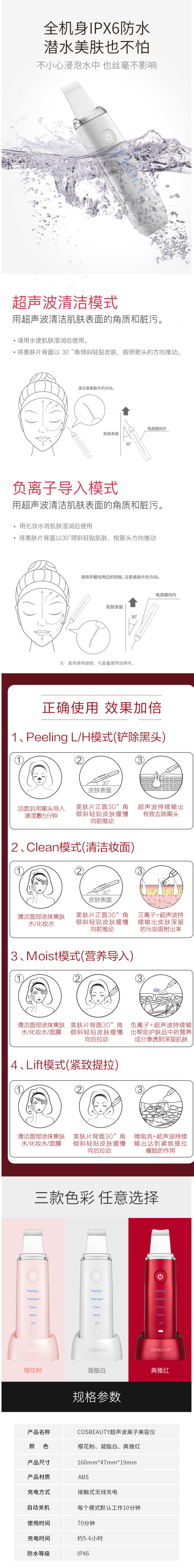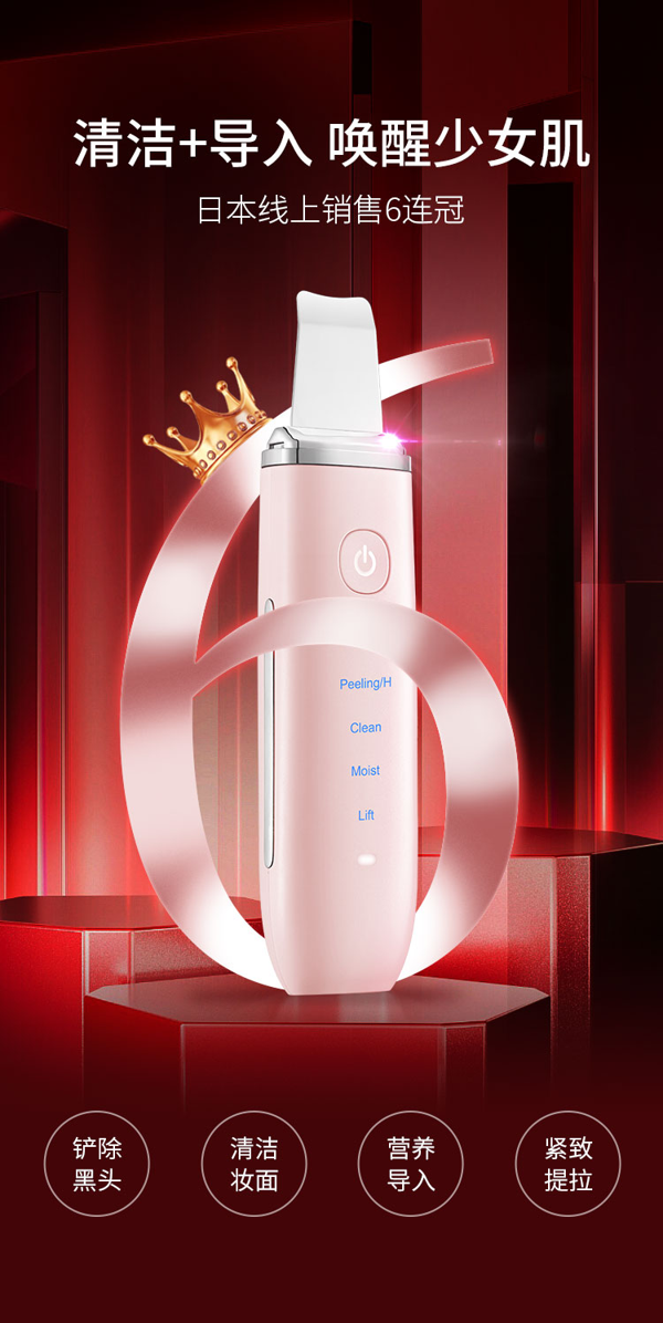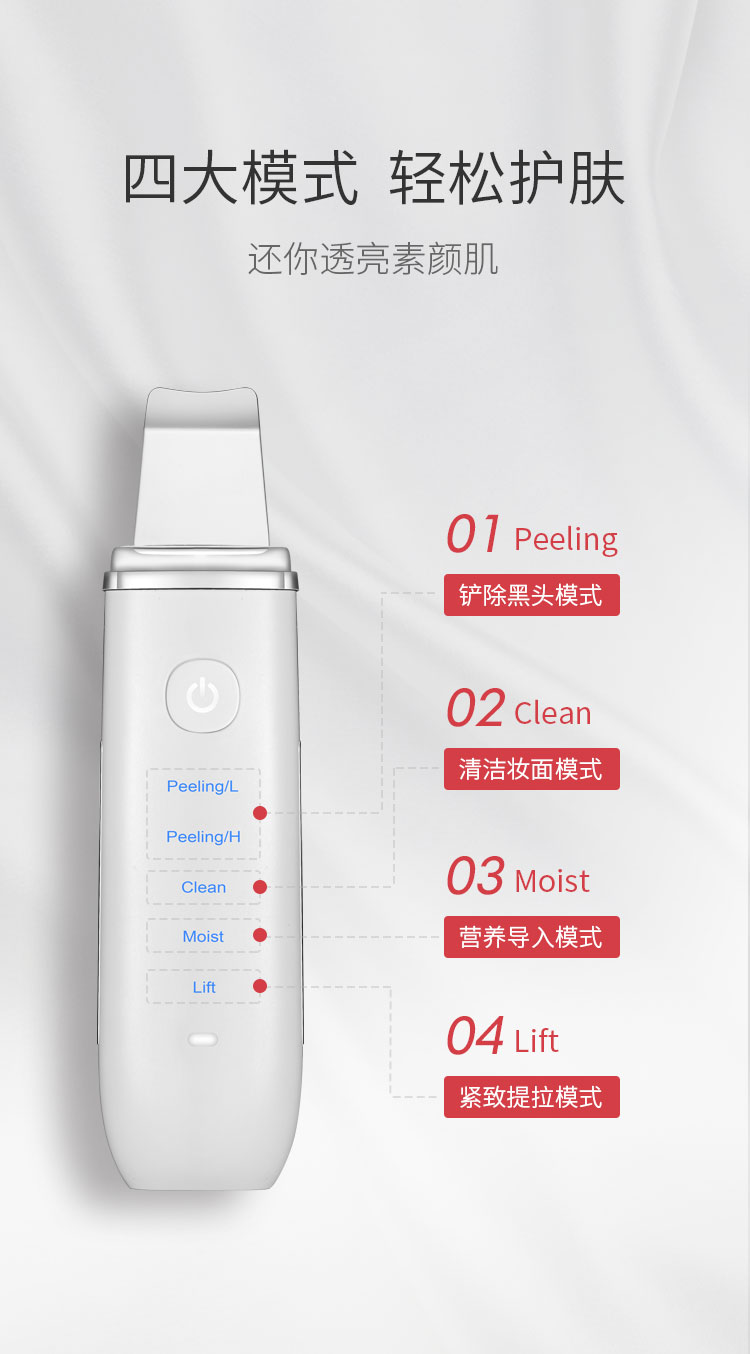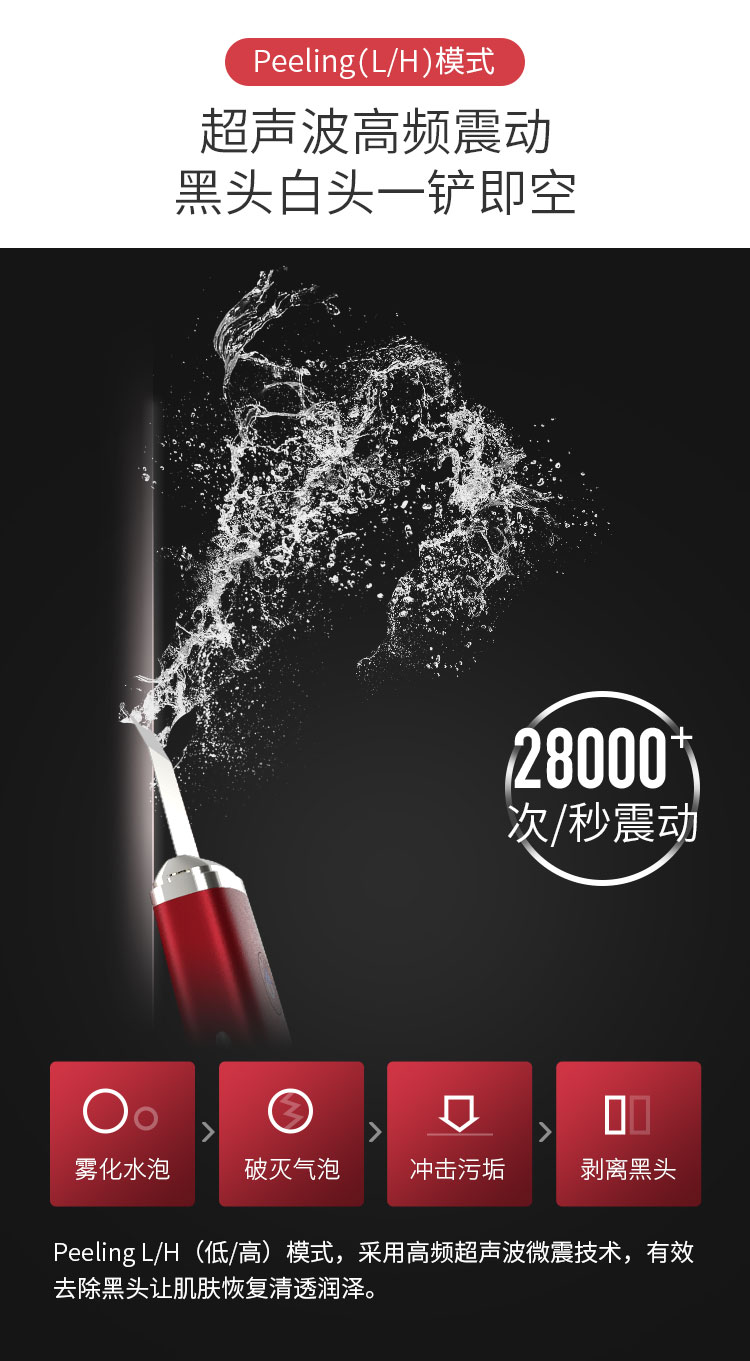 1.铲除/Peeling,铲除黑头模式,运用超声波雾化震动技术,每秒28000次震动,能铲出肌肤深层污垢(黑头/白头/粉刺),清理废弃角质;