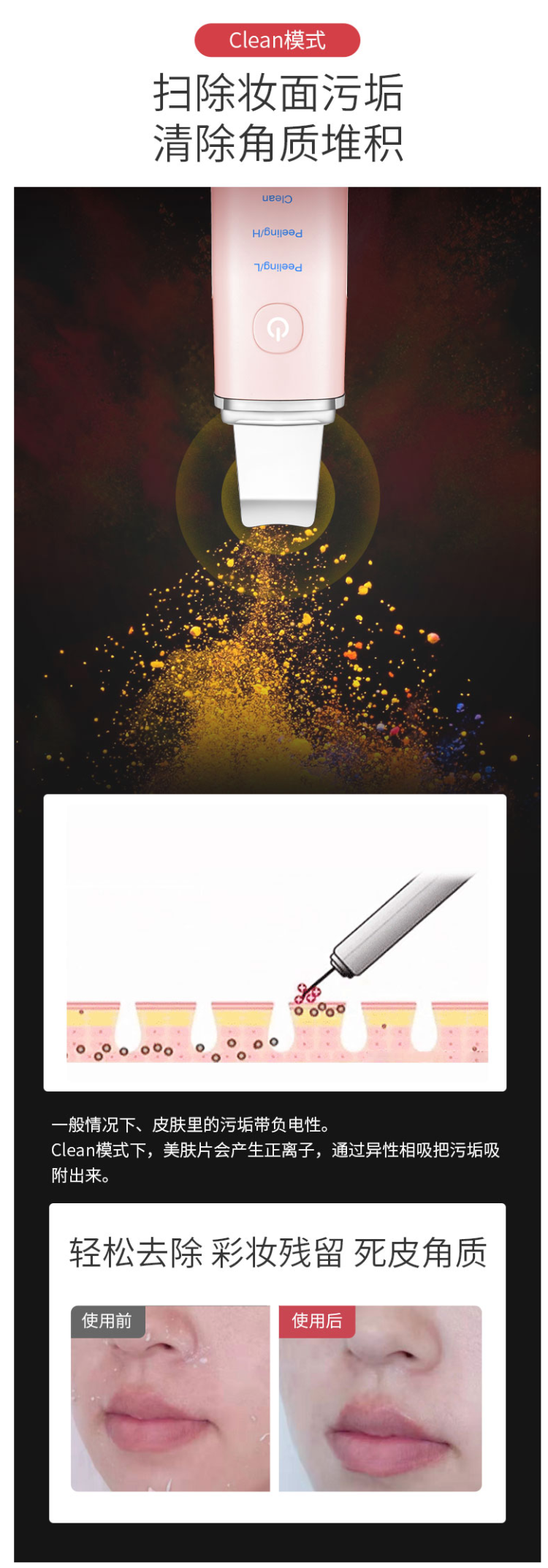 2.净颜/Clean,清洁妆面模式,清除妆面污垢,清除角质堆积。美肤片会产生正离子,通过异性相吸把带负电性的污垢从表层皮肤中吸附出来。
