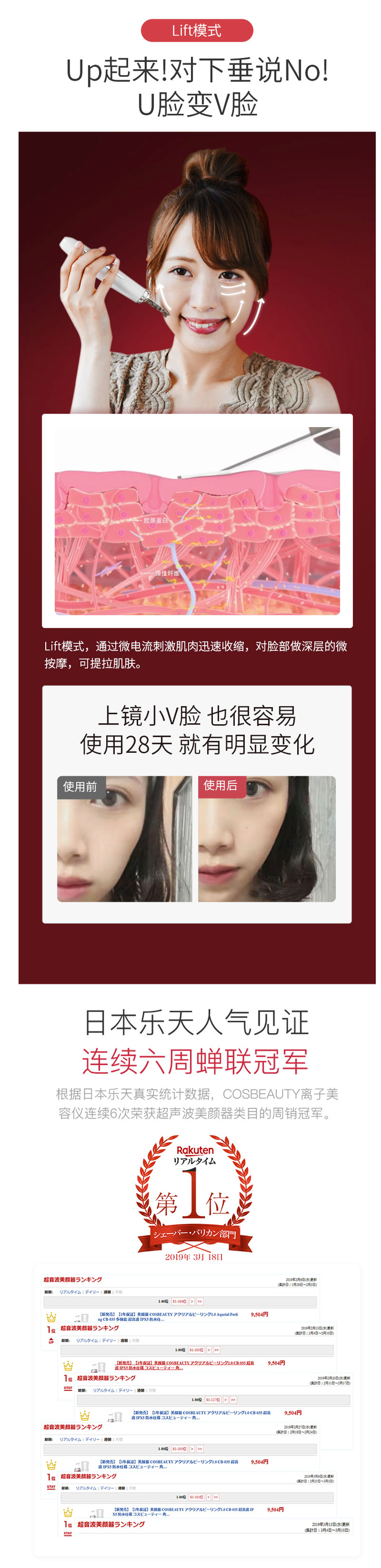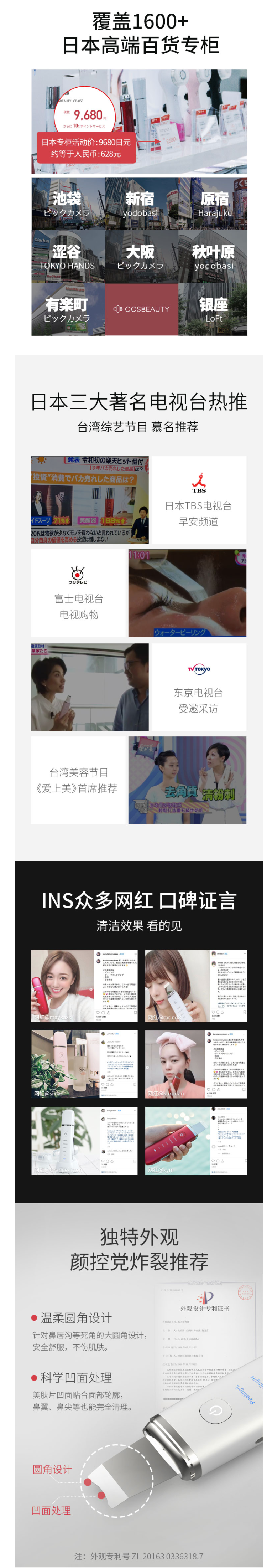 这款可思美超声波美容仪,在日本属于人气产品,受到日本电视台和各大明星网红亲测力荐,主要作用是清洁肌肤、促进吸收导入、改善肌肤松弛,除了脸部,手臂、腹部、颈部都能用。