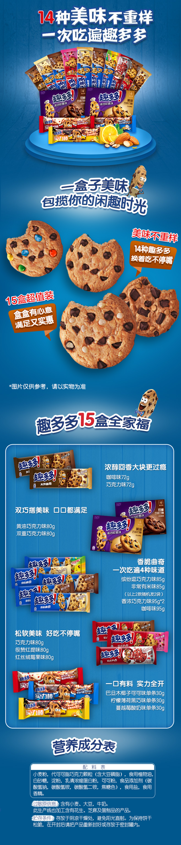 规格为1119g,共14种口味,15盒饼干,所有的饼干均为正装,不是因为礼盒就变成了定制缩小装,优选巧克力豆,口感香浓醇厚,脆脆的黑饼干,微甜不腻,吃过的都说好吃。
