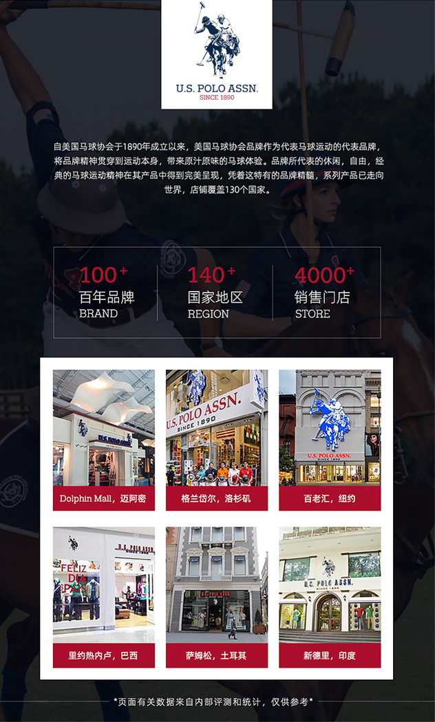 U.S. Polo Assn(美国马球协会)品牌是美国马球运动最真实的代表, 是由始于1890年美国唯一一家对马球运动具有监管权利的非营利性机构“美国马球协会”官方认可的。至今,品牌系列产品通过特许经营方式已覆盖超过135个国家,以专卖店、百货商店和品牌店模式经营。品牌产品多元化,包括男女服装、童装、配饰、箱包、手表、鞋履及家具等。