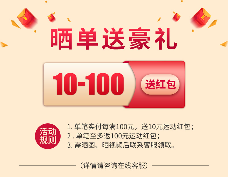 单笔实付每满100元送10元运动红包,共返现80元,实付799元,需要晒图、晒视频后联系客服领取。