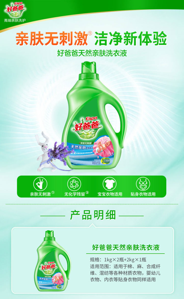 套装包含2kg瓶装、1kg瓶装*2,共8斤。立白旗下高端产品,猫超发售,品质靠谱,线下商超同售,黄磊代言,洗衣液温和不伤手,亲肤无刺激,去渍无残留,宝宝和贴身衣物都适用的洗衣液~