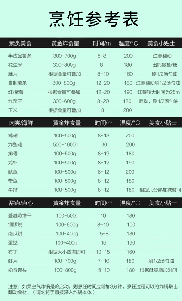 空气炸锅适合烹饪各种肉类、海鲜、薯条、蛋挞。也可加热买来的外卖熟食,如 披萨、香肠、猪蹄、面包片类之类的,还是很方便的,也是厨房中实用比较高的厨具。制作方法时间如下图所示。
