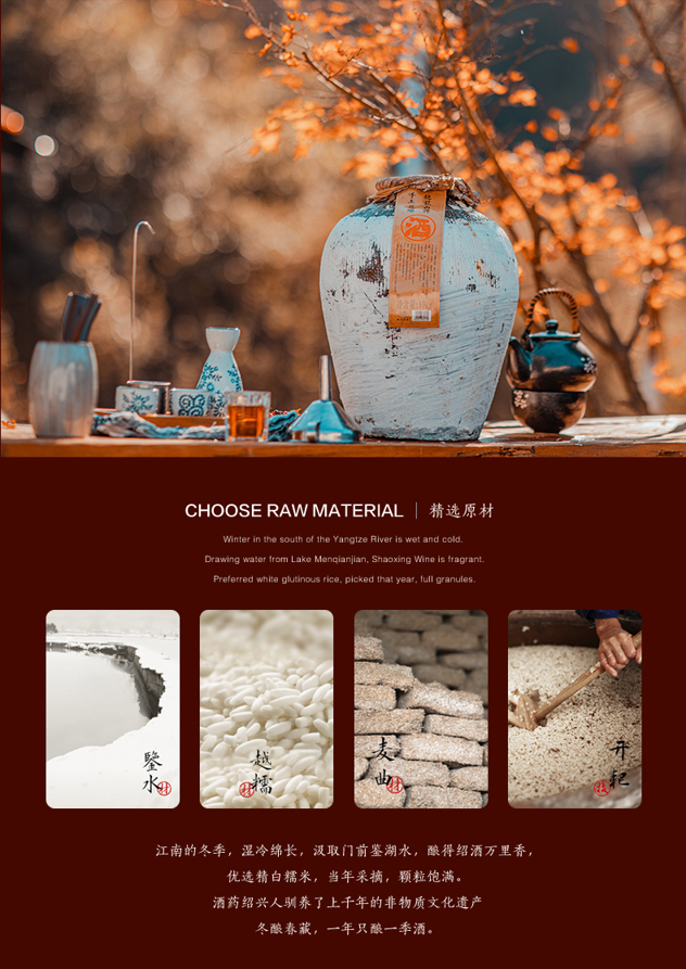 花雕酒含有对人体有益的多种氨基酸、糖类和维生素等营养成分,被称为“液体蛋糕”。根据贮存时间不同,花雕酒有三年陈、五年陈、八年陈、十年陈,甚至几十年陈等,以陈为贵。总的来说,花雕酒酒性柔和,酒色橙黄清亮,酒香馥郁芬芳,酒味甘香醇厚。