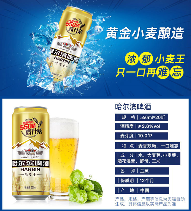 天猫哈尔滨啤酒旗舰店69.9元,可领15元优惠券,实付54.9元到手,500ml*20听。哈尔滨啤酒,诞生于1900年,由俄罗斯商人乌卢布列夫斯基创建。现在隶属百威英博啤酒集团旗下,是国内较早的啤酒品牌,拥有冰纯、小麦王、冰爽等系列产品。这款哈尔滨小麦王啤酒优选黄金小麦酿造,传承百年哈啤醇正风味,口感平顺甘醇,泡沫浓厚,麦芽度为10.0°P,酒精度≥3.6%vol。规格:550ml*20听