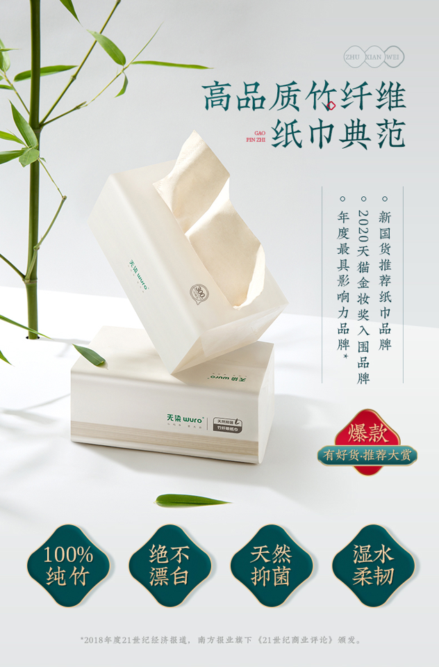 这款抽纸无漂白,无有害添加,抽纸可直接接触食品,内部添加天然提取的竹锟精华,抑菌率高达99%,具有多孔纤维,可以瞬间吸收和蒸发水分,湿水后韧性更强,擦拭后不易松散,干湿两用,大小适中。