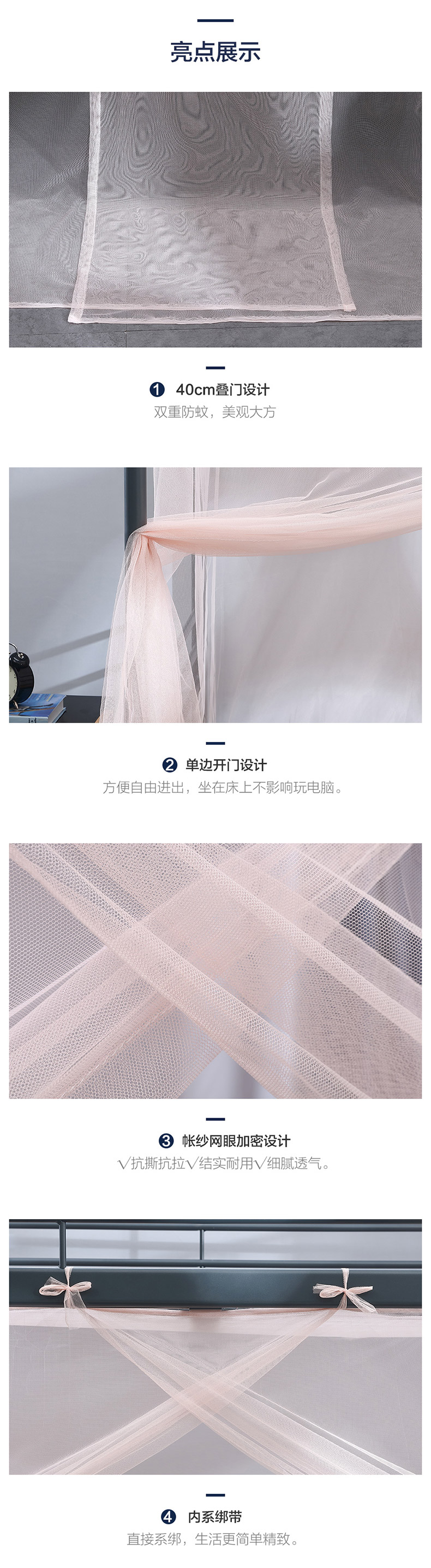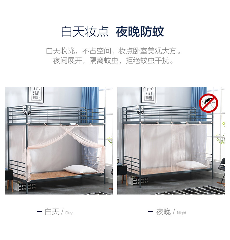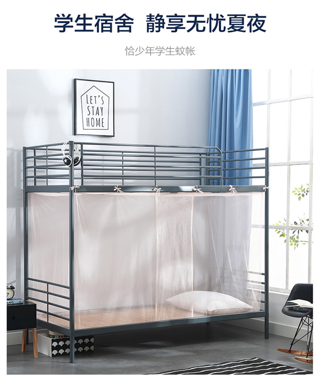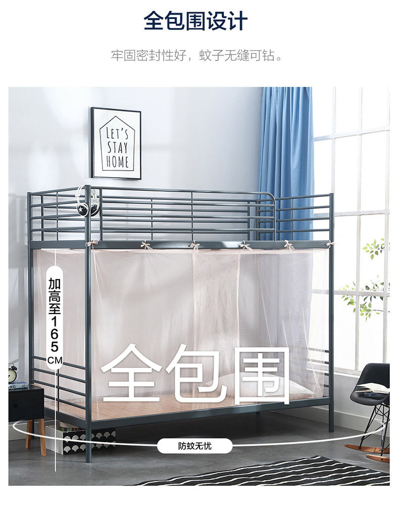 这款LOVO 免安装学生宿舍上下床蚊帐,帐纱网眼加密,抗撕抗拉,结实耐用,细腻透气;全包围设计,牢固密封性好,影子无缝可钻;40CM叠门设计,双重防蚊,美观大方;内系绑带,直接系绑,简单方便。