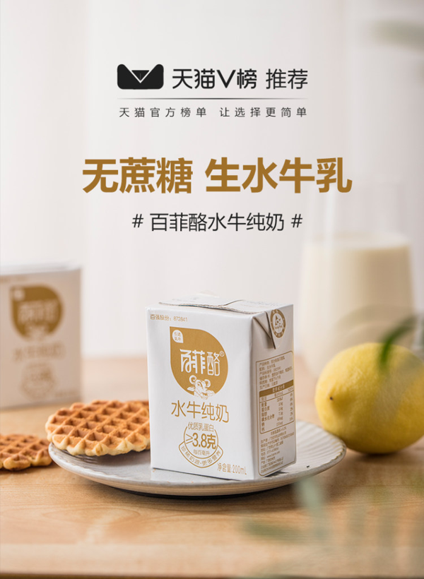 天猫百菲酪旗舰店114.8元,可领25元优惠券,实付89.8元到手。15年历史,上市企业,国内最大的水牛奶企业出品,舌尖上的中国重点推介的食材,比普通牛奶更香更醇,非常适合对牛奶味道要求高的童鞋。