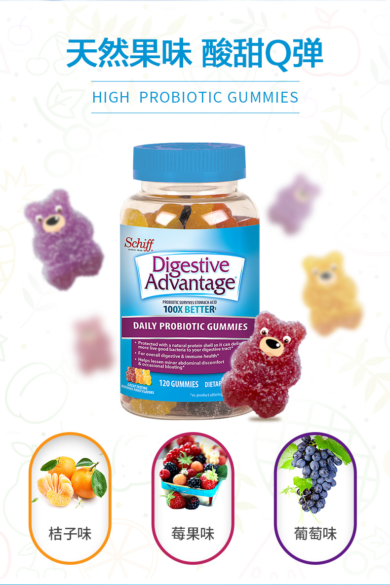 这款Schiff的Digestive Advantage 儿童活性益生菌小熊软糖,专为儿童设计,可调理宝宝肠胃、促进宝宝消化、防止宝宝胀气和便秘,在美国益生菌软糖品牌中排名第一,规格是80粒,适合3岁以上儿童服用,每天1-2次,每次2粒,每粒糖果中仅含1.5g糖,口感Q弹,浓郁果香,孩子们会非常喜欢。