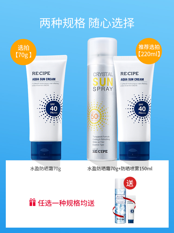 推荐第2款包含水晶防晒喷雾 150ml+水盈防晒霜 70g 还送芦荟喷雾和小样。