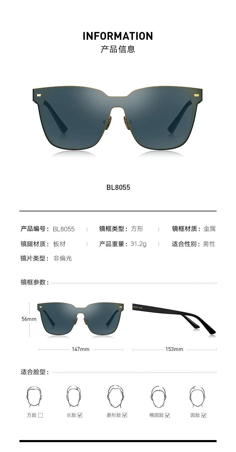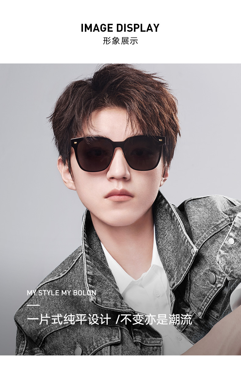 这款是暴龙板材太阳镜的主打款,王俊凯海报同款,戴着十分大气,非常适合比较Man的男士。框架和镜片是一样式设计,非常轻薄,适合长脸、菱形脸、椭圆脸、圆脸佩戴。