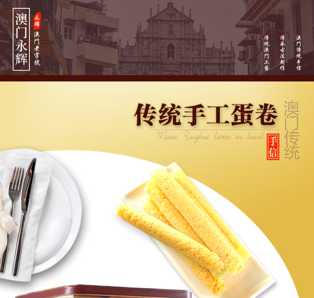 澳门永辉始创于80年代,是来自澳门手信老字号的代表,是传统特色产品的产销一体化企业,80年代初首创椰汁蛋卷皇、紫菜肉松凤凰卷、粒粒杏仁饼并延续至今。澳门永辉初创时,专供澳门各大手信饼家及超市,是澳门首家蛋卷、西饼OEM供应商,专业生产澳门特产。