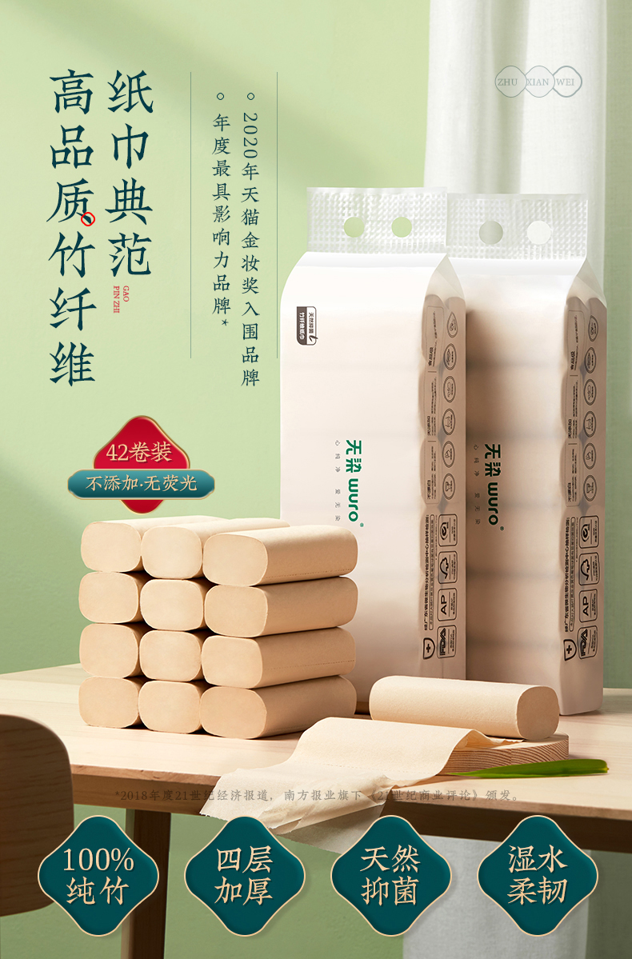 • 小米众筹爆款 无染 食品级 竹纤维抑菌卷纸 4层加厚*42卷 39.9元包邮