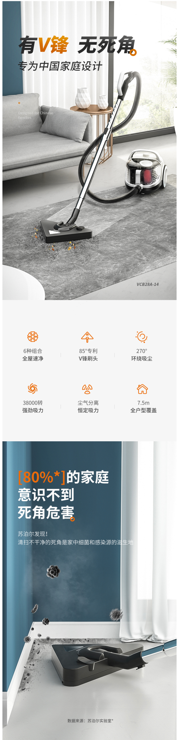 这款苏泊尔VCB28A-14 手持吸尘器,属于V锋系列,创新专利85°V锋刷头,完美贴合墙壁,全屋覆盖无死角清扫,无论是高处死角、地毯死角、缝隙死角还是深度死角,都能彻底清扫。