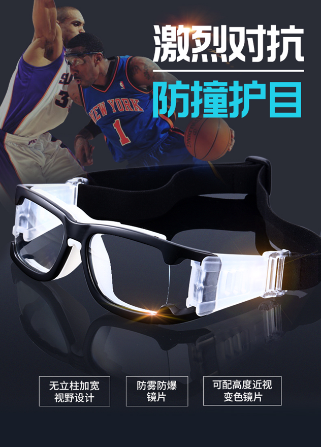 这款是为健身运动人士设计的护目镜,防雾防爆镜片,出汗不气雾,镜框采用PC材质,具有优越的抗冲击,柔韧性,耐磨性,激烈运动过程中,眼镜不易碎,安全程度高。细节上去掉了传统篮球眼镜的立柱,使眼镜的视野更开阔,镜框具有排汗槽,透气性好,不滴汗。