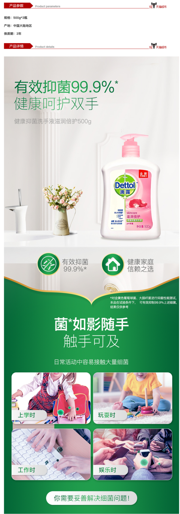 这款滴露抑菌洗手液,主要有效成分是PCMX,可有效杀灭99.9%的细菌,包括大肠杆菌、金黄色葡萄球菌、沙门氏菌等细菌,PH值与人体肤值接近,完全不伤手,使用时还有淡淡的清香。