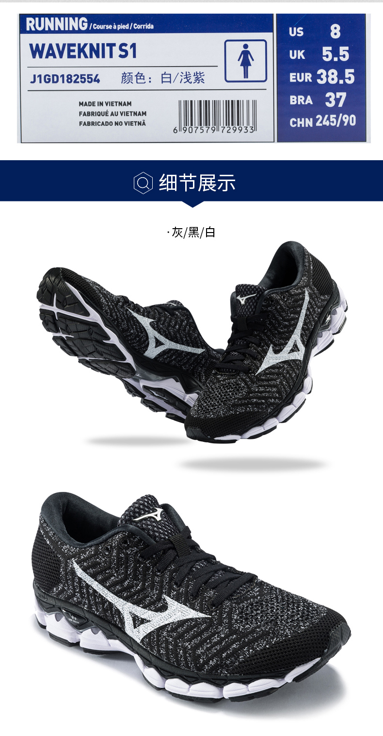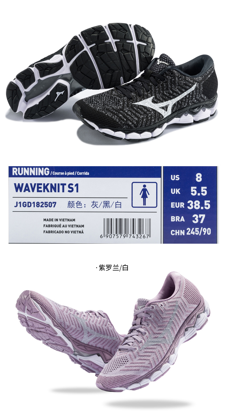 这款美津浓女耐磨编织透气慢跑鞋,是2019年的秋季款,鞋面使用高弹一体织纱线制成,就像织毛衣,有着像袜子一样的舒适包裹感,没有缝纫处的摩擦,透气也特别好,还贴合高弹无束缚。