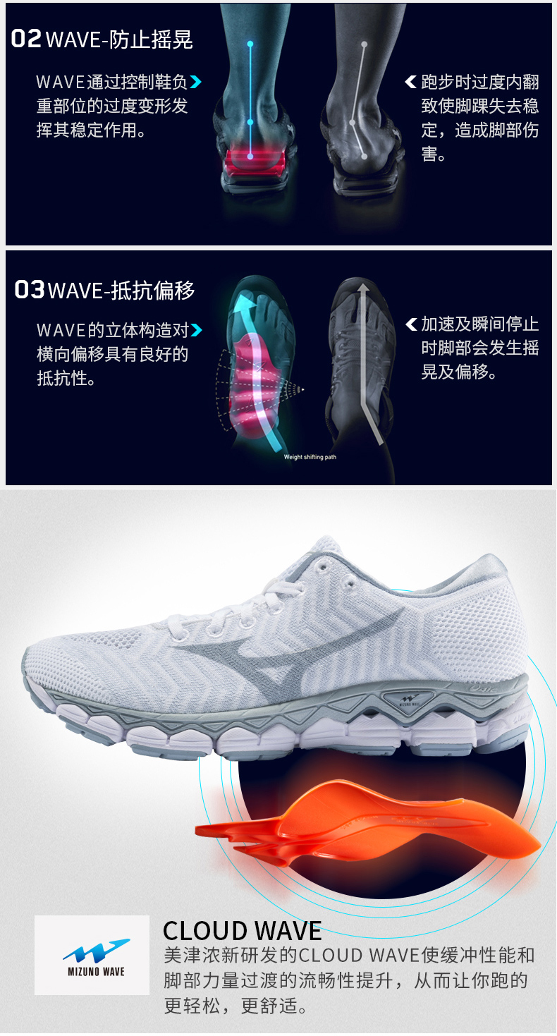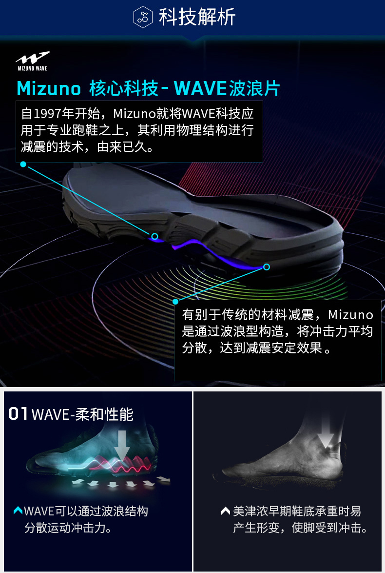 内置Mizuno核心的WAVE波浪片,有别于传统的材料减震,Mizuno是通过波浪型构造,将冲击力平均分散,达到减震安定效果。