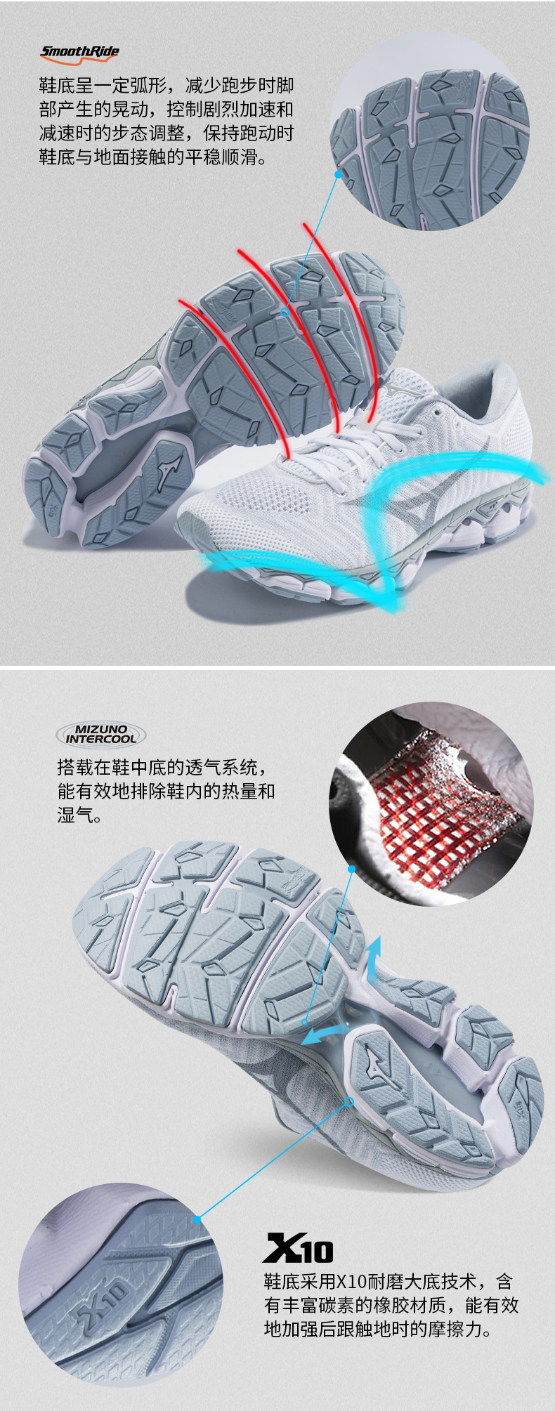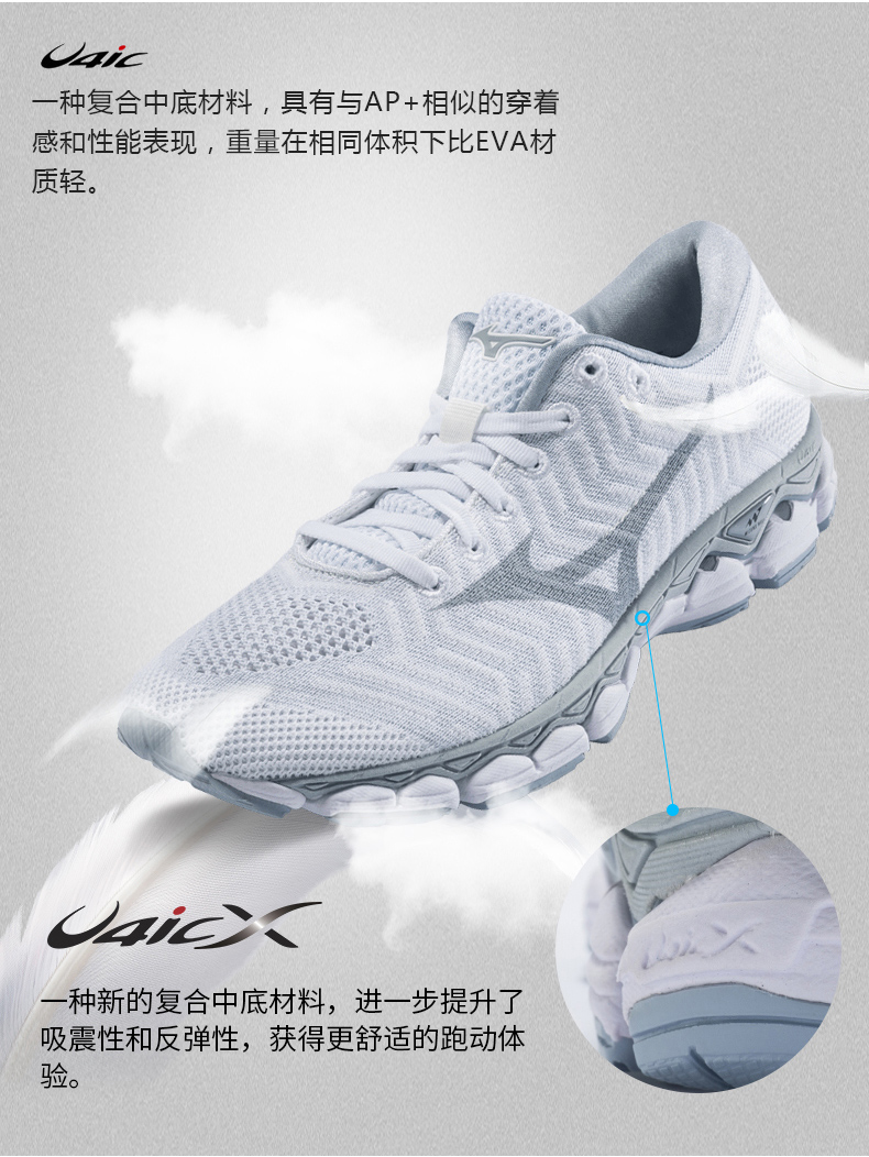 中底则使用美津浓新研发的CLOUD WAVE材质,进一步提升了吸震性和反弹性。这是一种复合材料,具有与AP+相似的穿着感和性能表现,重量在相同体积下比EVA材质轻。