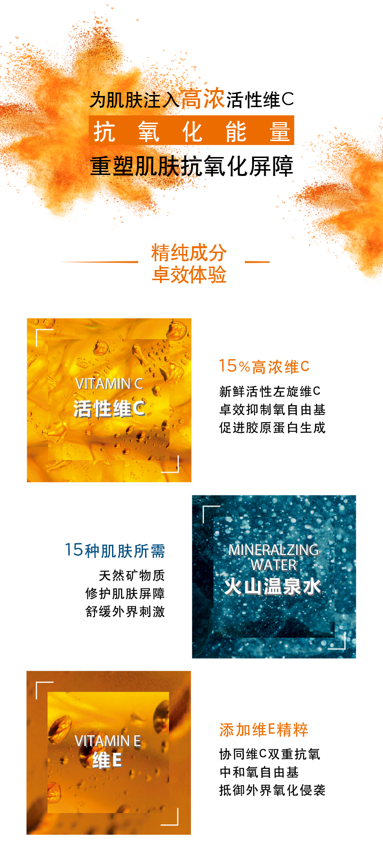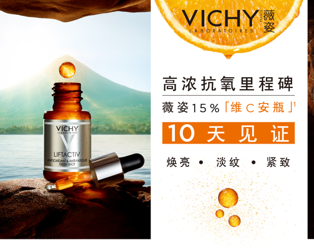 这款VICHY 薇姿 活性维C修护安瓶精华液 ,规格:10ml,内含15%高浓左旋维C、0.2%天然新橙皮苷、0.2%松树皮提取物、0.5%VE,这些都是超强抗氧化组合配方,VC活性高。主打提亮肤色,淡化细纹等。活性左旋维C,具有超强的抗氧化力,日间使用可以很好的对抗日间的氧化压力,对抗并预防这些肌肤问题产生,后续务必记得搭配防晒使用哦。PH值低于3.5,确保皮肤充分吸收。连用10天,皮肤明显变得有光泽,而且更柔软。
