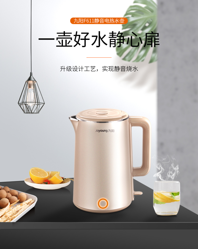 九阳K17-F67S用的就是304不锈钢和Sitrix温控器。使用360°均匀环绕立体加热技术,加热面积大幅度增加,从而减少了单位内水的热负荷,从而降烧水噪音,只有52db。(注意:不是完全静音,只是相比普通的电水壶声音小不少)。