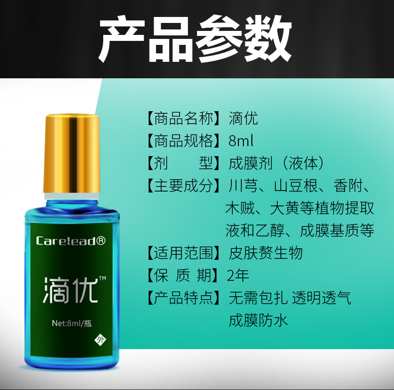 这款滴优 鸡眼膏贴,草本萃取配方—川芎、山豆根、木贼、大黄、香附等,使用生物膜技术,涂抹后半分钟即干燥成膜,无需包扎,吸收洗澡都不怕。