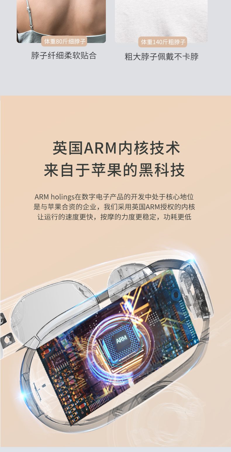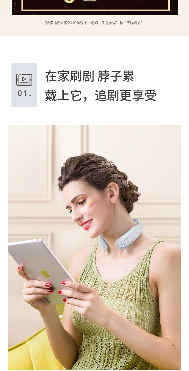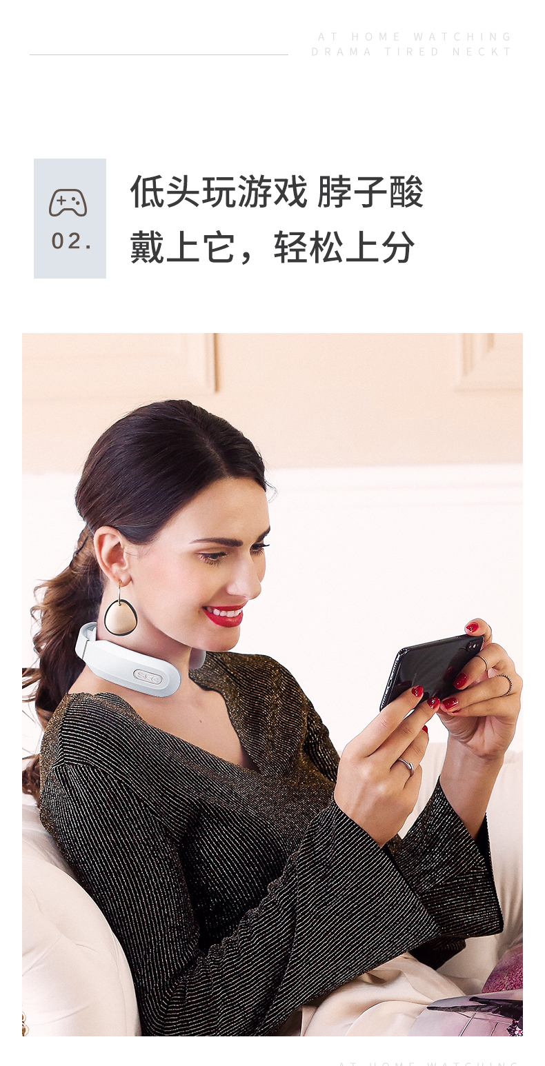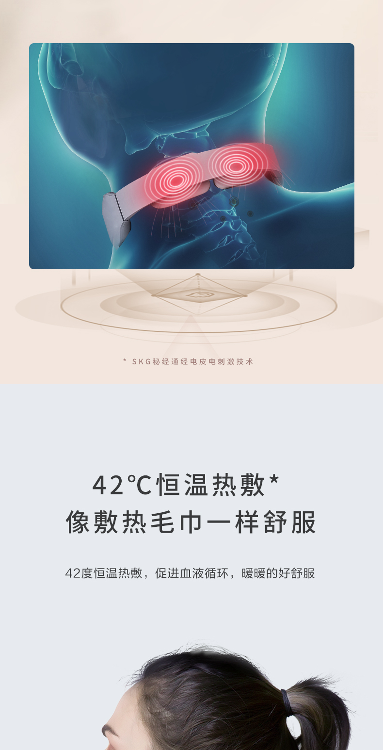 微电流模拟人工按摩的捏、揉、捶、压、拍等方式,达到促进血液循环、缓解疼痛效果。适用于日常保健、落枕等颈部损伤、慢性颈椎劳损。能42°恒温热敷,更好的活络气血。