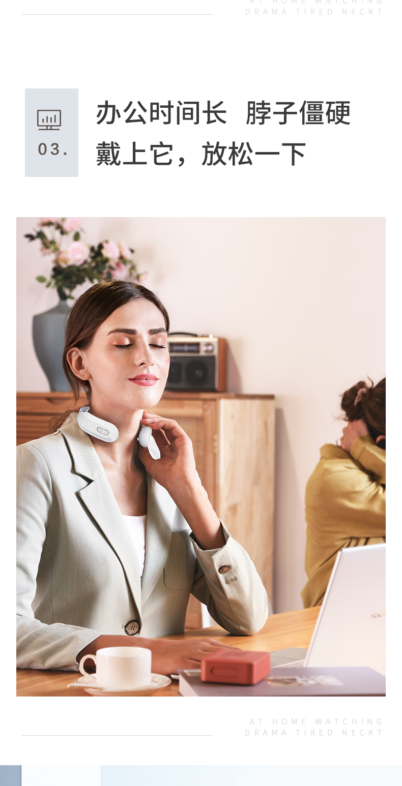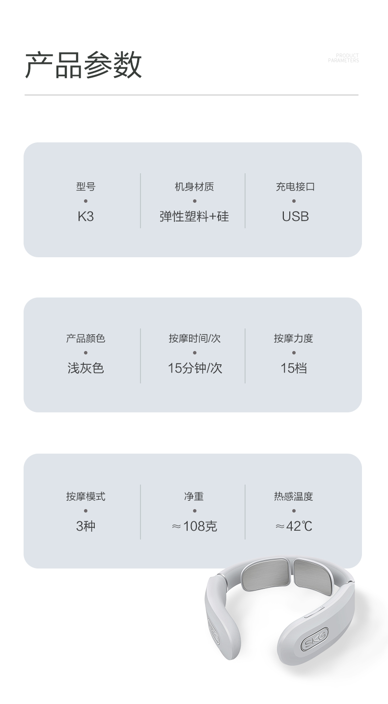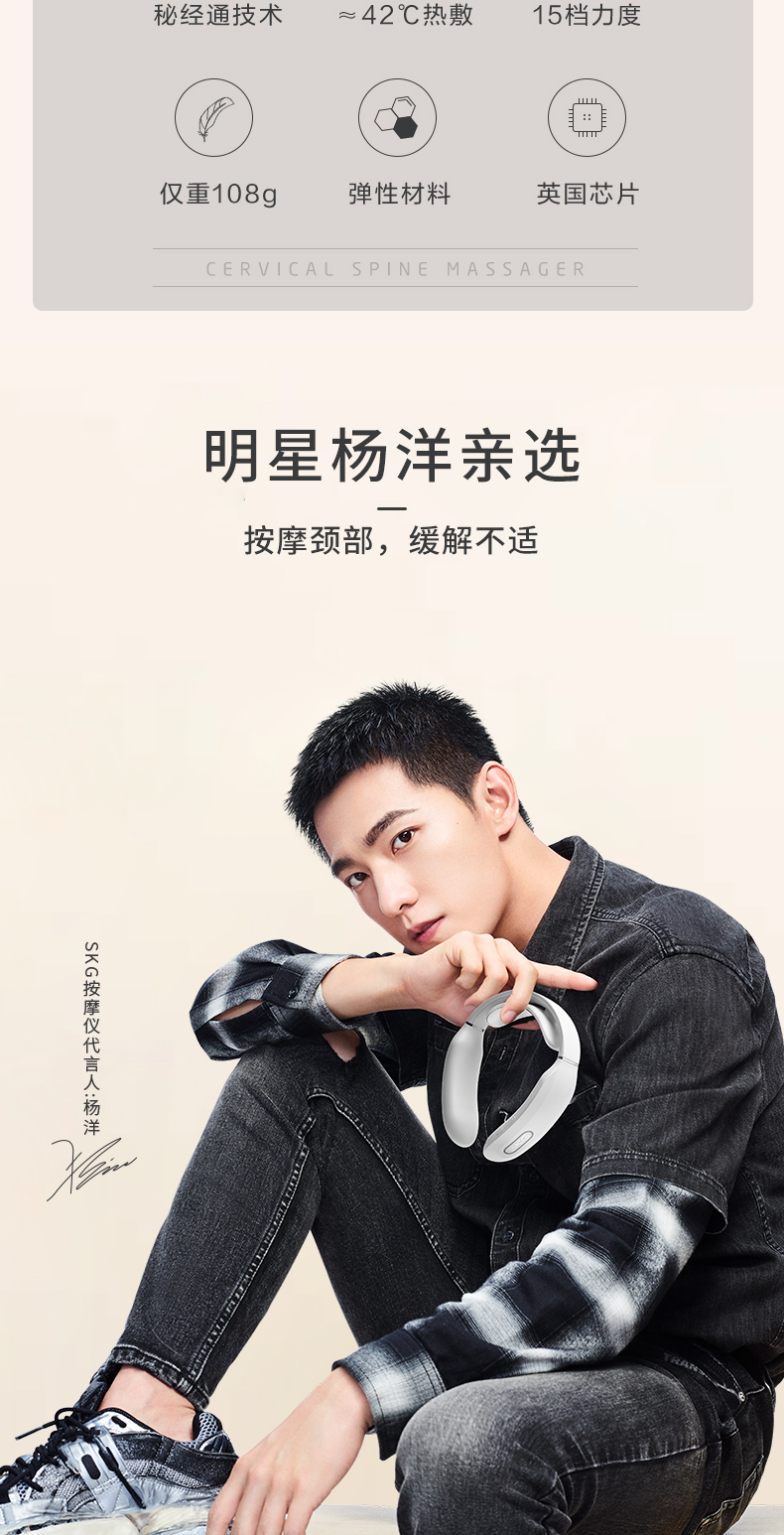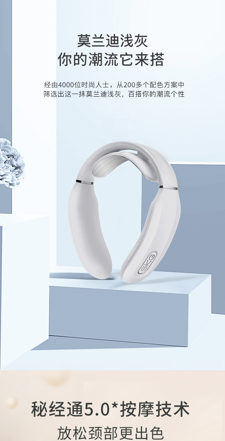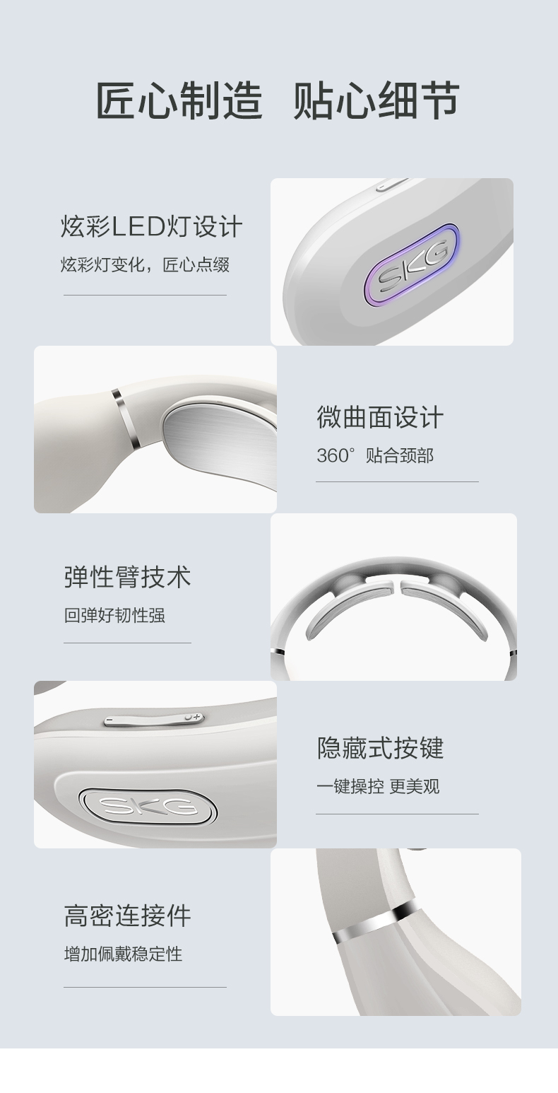 微电流模拟人工按摩的捏、揉、捶、压、拍等方式,达到促进血液循环、缓解疼痛效果。适用于日常保健、落枕等颈部损伤、慢性颈椎劳损。能42°恒温热敷,更好的活络气血。