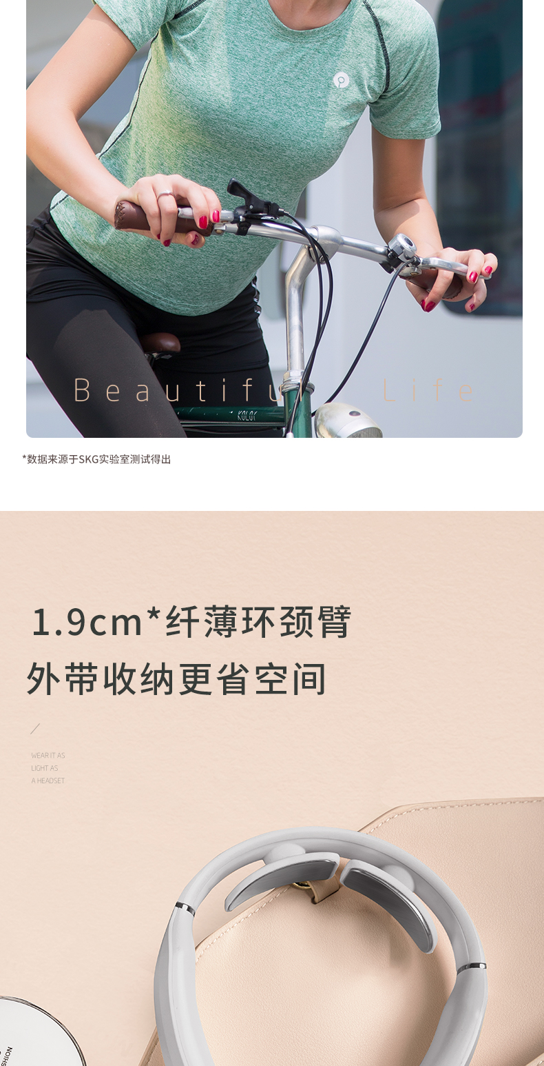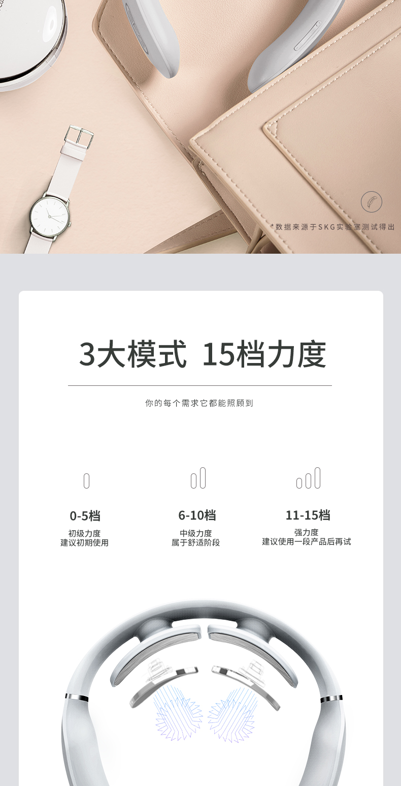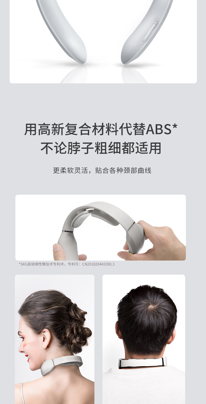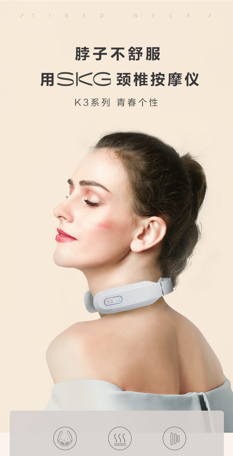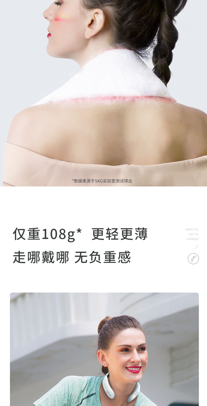 这款SKG TENS低频脉冲颈椎按摩器,是2019年新品,运动版,仅168克便于携带,使用时一点也不重。利用微电流脉冲模拟多种按摩手法,舒缓肌肉紧张,达到放松的效果。