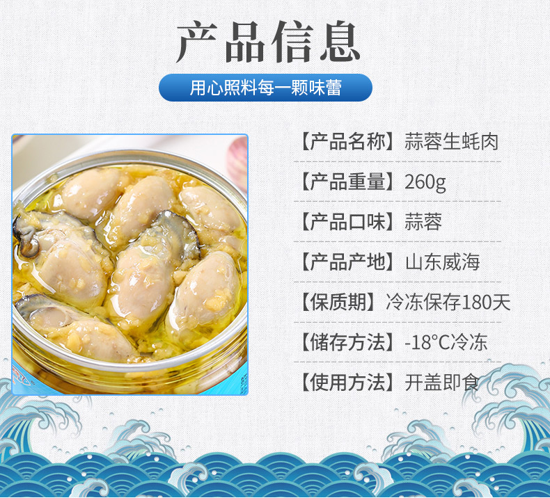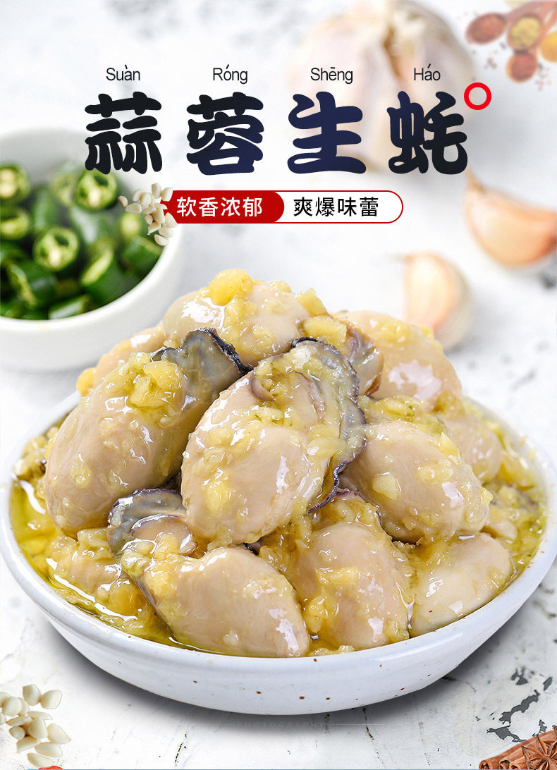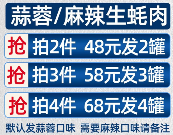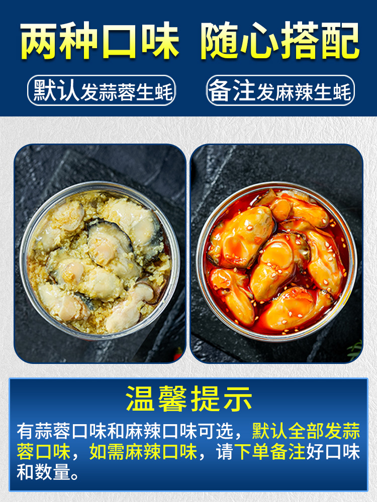 天猫船长是我表哥旗舰店。参加店铺活动满减,拍2件48元,拍3件58元,拍4件68元。有香辣/蒜蓉两种口味,下单备注口味和数量。精选当天捕捞生蚝,蒜蓉汤味浓郁,色香味美,真空杀菌密封罐装。生蚝含有糖本和牛磺酸,补肾益精,可以缓解每天辛苦工作造成的压力和控制血压的升高。