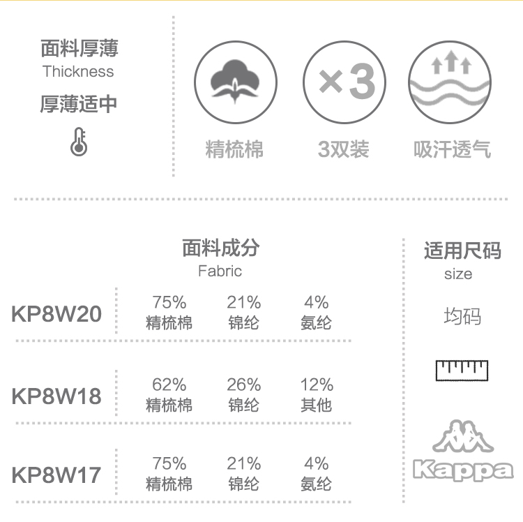 天猫kappa内衣旗舰店49元,可领20元优惠券,实付29元到手,3双装,短款此价,中筒款要贵10元。Kappa的运动袜系列选用的是40S精梳棉,它的特点是棉感强,柔软舒适,透气吸汗;螺纹坑条设计,用的4070的莱卡拉架,回弹力好,有轻微缓震功能;脚尖仿对目工艺,无骨感,不咯脚更舒适。