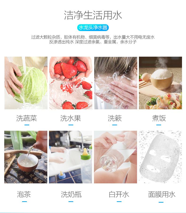 有效滤除自来水中的泥沙、铁锈、胶体、余氯、异味等有害物质;带有可拆卸设计,滤芯可以拿出来清洗,之后依然可以继续使用,可切换原水/净水模式,延长滤芯使用寿命。适合家中没有条件拆装大型净水设备的家庭使用。