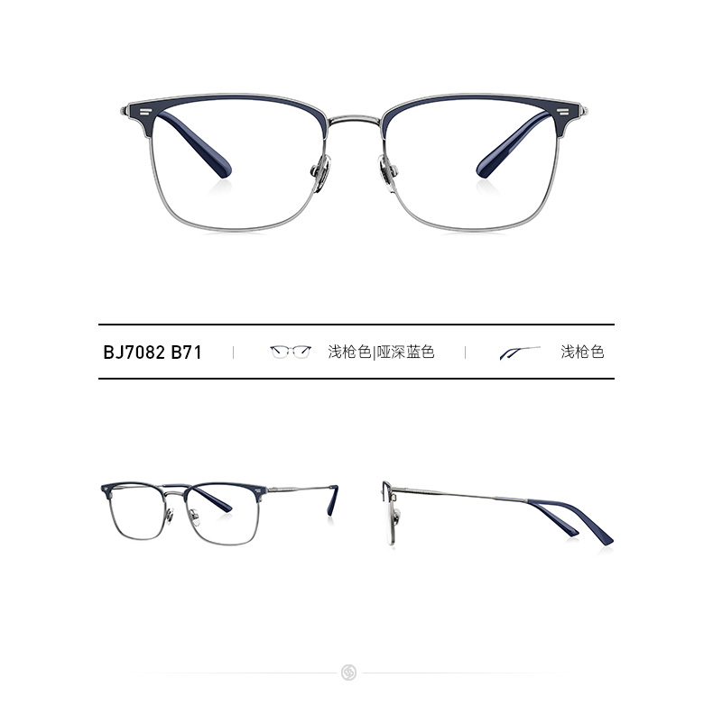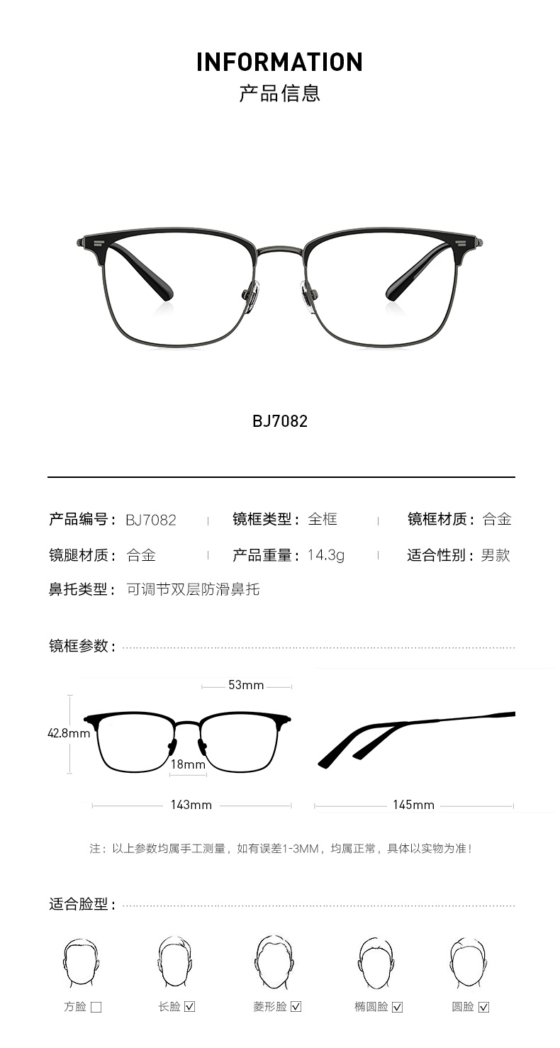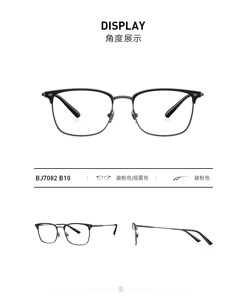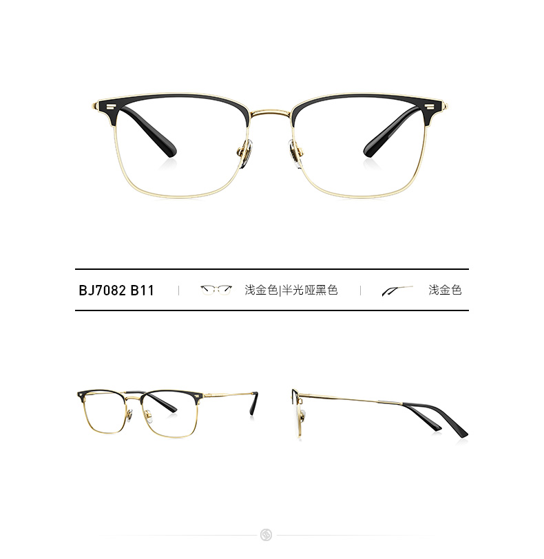 这款暴龙BJ7082全框光学镜架,是2019年的新款,是男女都能佩戴的中性款。镜框上部是平框齐眉设计,下部则是多边半弧形,透露着浓浓的复古风,适合长形、菱形、椭圆形、圆形脸佩戴,基本上不挑脸型了。